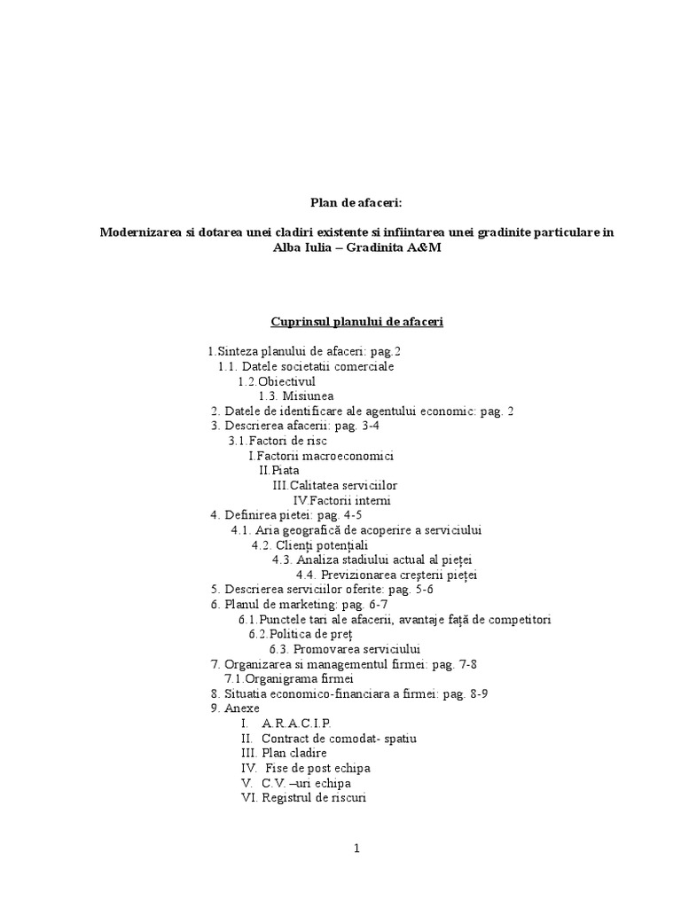 Plan De Afacere Gradinita Particulara Sc Vuk Srl Diploma Ro Source from : https://www.diploma.ro/licente/plan-de-afacere-gradinita-particulara-sc-vuk-srl-2892 Mai jos poate fi vizualizat un extras din document (aprox. Am ramas putin cu ea, in 5 idei de afaceri cu investitie minima si profit maxim + model de plan de afaceri. Scurta descriere a modelului de afacere. Plan de afaceri exemplu se va adresa cu precadere tinerilor, studentilor in special, datorita amplasarii in zona regie. 100%(2)100% encontró este documento útil (2 votos).