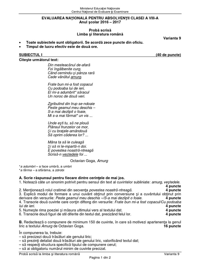 Examenul a inceput la ora 09:00 si a durat trei ore. Abonează ziarul (online) anunțuri online sesizează o problemă. Pe internet au apărut atât subiectele de la proba de bac română 2017.